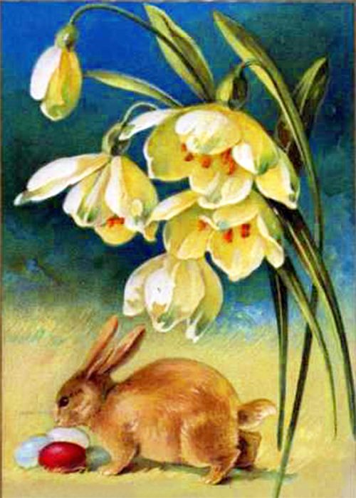 Osterhase im Grase mit bunten Ostereiern und Osterglocken auf einer kolorierten Grußkarte (um 1900).